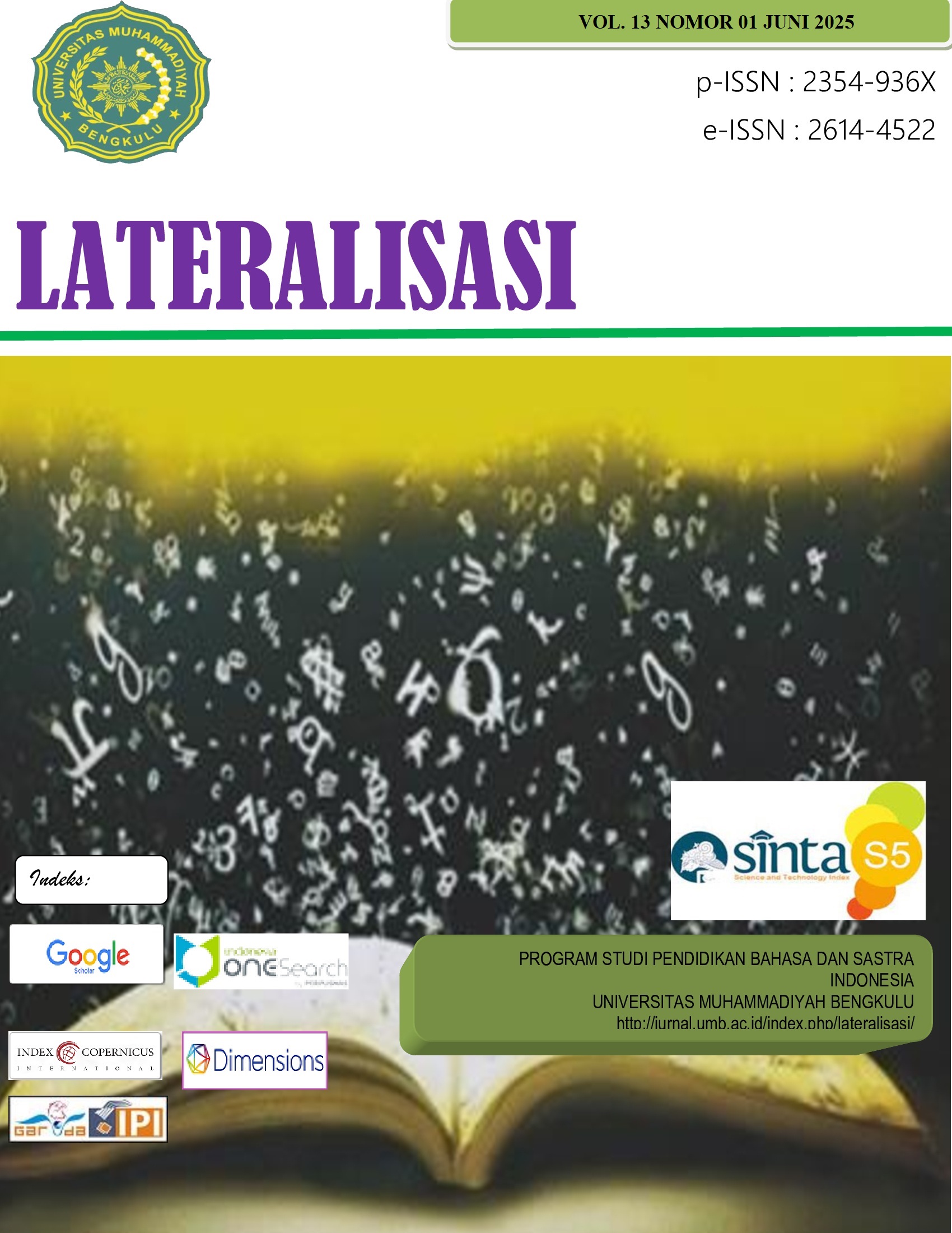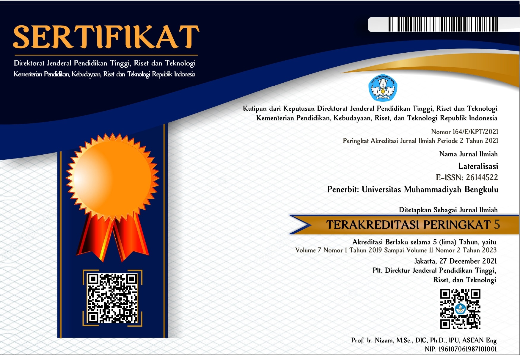 Jurnal Lateralisasi merupakan jurnal terbitan di bawah naungan Program Studi Pendidikan Bahasa dan Sastra Indonesia – Fakultas Keguruan dan Ilmu Pendidikan, Universitas Muhammadiyah Bengkulu. Jurnal ini membahas tentang Penelitian Pendidikan Bahasa, Sastra, dan Indonesia (Daerah ) yang merupakan jurnal berbasis Penelitian Pendidikan Bahasa dan Sastra Indonesia, beserta penelitian yang berkaitan dengan implementasi dalam pembelajaran Bahasa dan Sastra Indonesia dengan p-ISSN: 2354-936X ; e-ISSN: 2614-4522.